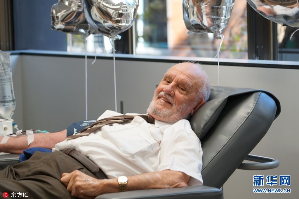 5月18日报道,澳大利亚老爷子James Harrison今年81岁了,他的血液里含有一种特殊抗体,能有效帮助新生儿避免恒河猴溶血病。本月11日,他前往当地红十字会血库,完成人生中最后一次捐血。他曾捐献过1100多次血液,成为全世界献血最多的人,挽救了上百万婴儿的性命。(图片来源:东方IC)