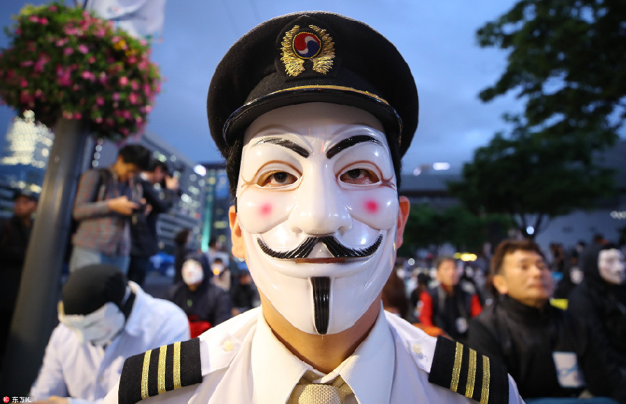 当地时间2018年5月18日,韩国首尔,大韩航空有限公司的飞行员戴着盖伊·福克斯面具,在首尔市区集会抗议,反对大韩航空会长兼首席执行官赵亮镐及其家庭。