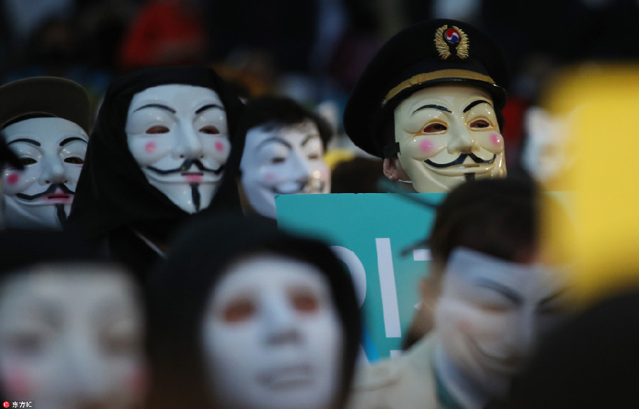 当地时间2018年5月18日,韩国首尔,大韩航空有限公司的飞行员戴着盖伊·福克斯面具,在首尔市区集会抗议,反对大韩航空会长兼首席执行官赵亮镐及其家庭。