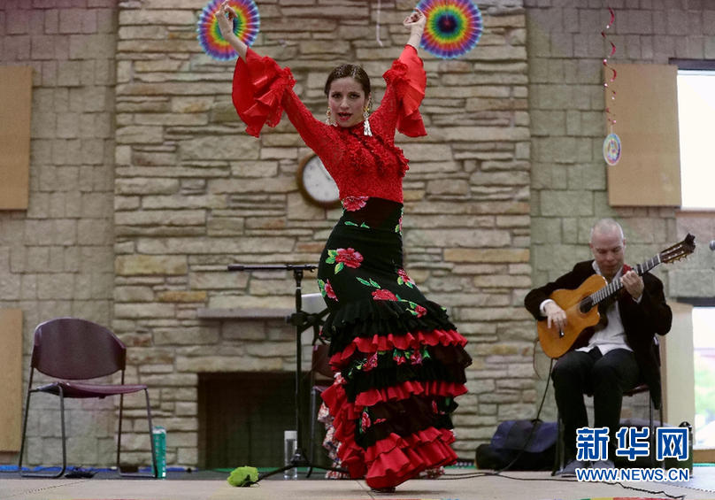 5月19日,来自西班牙族裔社区的一名女性在第28届美国斯科基国际文化节上表演弗拉门戈舞。 新华网记者汪平 摄
