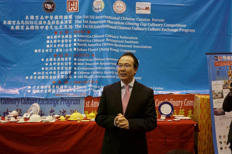 5月19日,在美国芝加哥,中国驻芝加哥总领事洪磊在美国餐饮展中国展区发表讲话。 中国驻芝加哥总领馆供图。