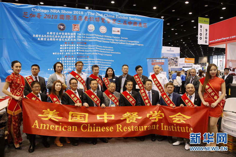5月19日,在美国芝加哥,美国餐饮展中国展区主办方之一美国中餐协会成员合影。 新华网记者 汪平摄