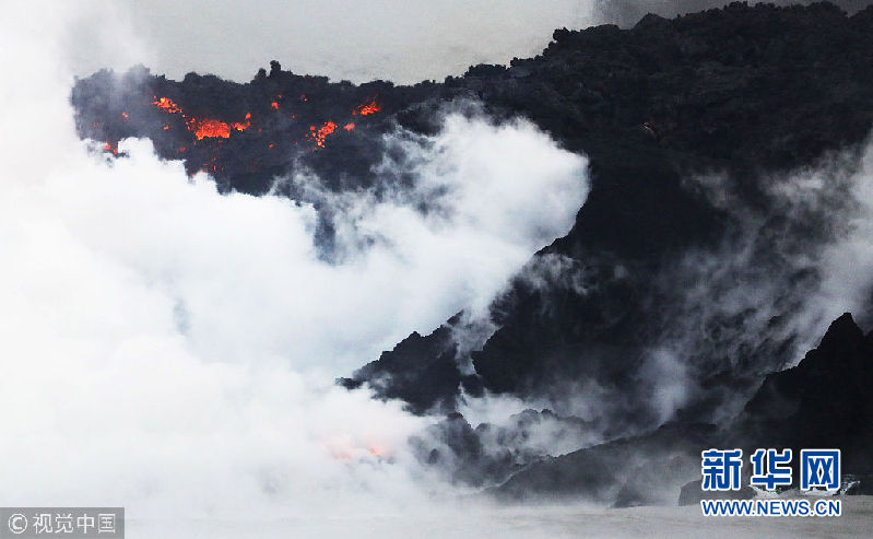 夏威夷火山熔岩流入太平洋 有毒“蒸汽云”升腾火光交映