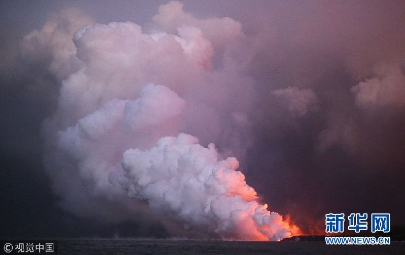 夏威夷火山熔岩流入太平洋 有毒“蒸汽云”升腾火光交映