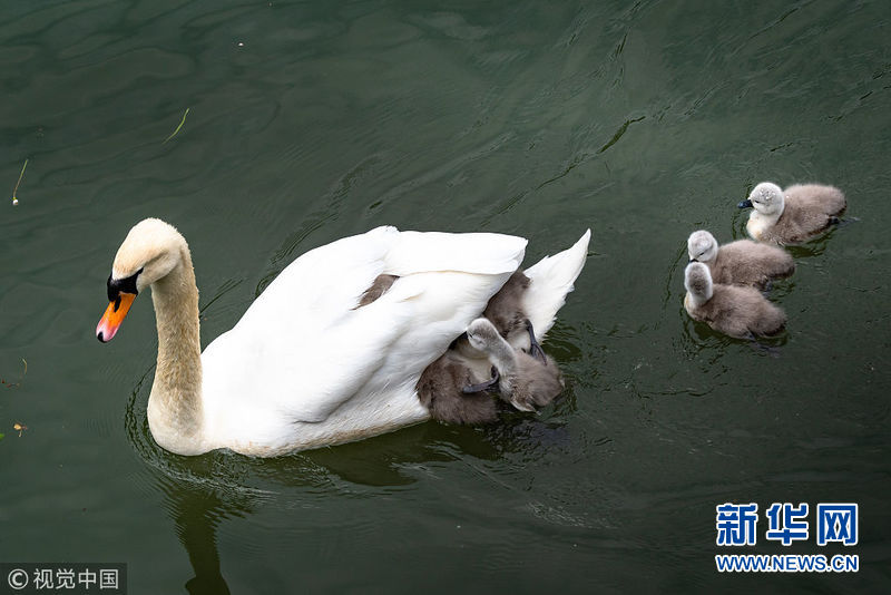 英国:天鹅妈妈载宝宝游湖 小天鹅紧紧依偎似“旅行团”