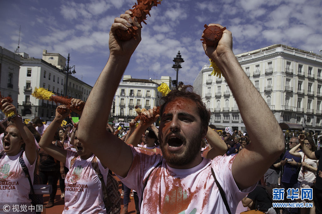 5月27日,西班牙马德里,抗议者走上马德里街头游行示威,呼吁政府取缔斗牛活动。(图片来源:视觉中国)