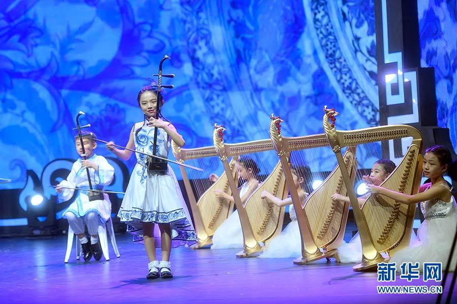 2017年8月22日,来自中国的青少年在北京举行的2017年上合组织成员国青少年艺术展演上表演民乐合奏《国风》。新华社记者 金良快 摄