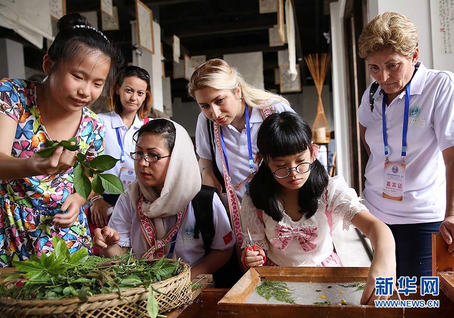 2017年8月15日,“魅力非遗——第二届上海合作组织夏令营·非物质文化遗产交流体验”活动在贵州省黔东南苗族侗族自治州丹寨县万达小镇举行。这是外国手工艺人在古法造纸体验馆了解花草纸的制作过程。新华社发(黄晓海 摄)