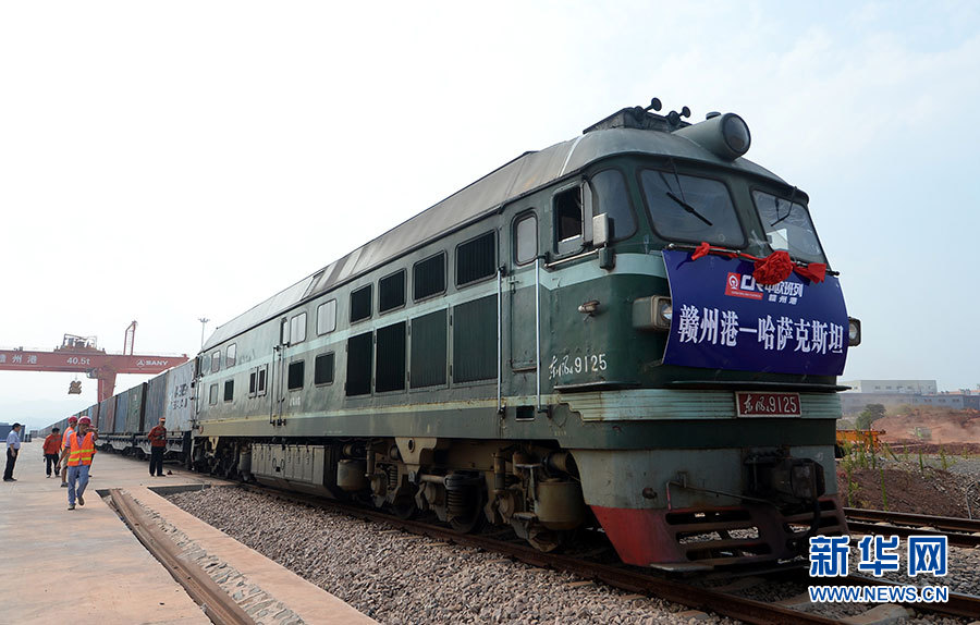 在江西省赣州市南康区赣州港,“赣州港至哈萨克斯坦”中欧班列等待发车(2017年7月27日摄)。新华社记者 彭昭之 摄