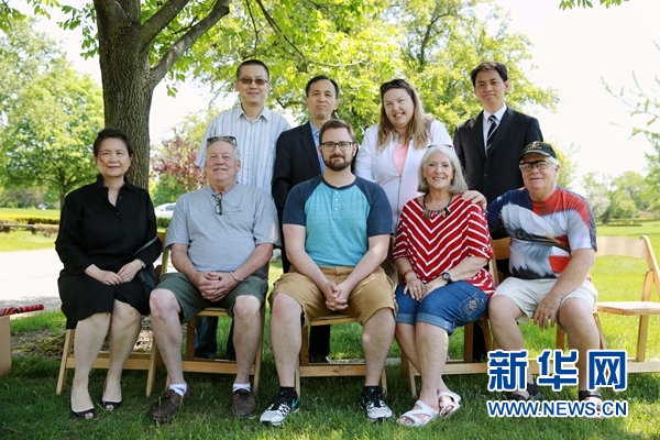5月28日,中国驻芝加哥总领馆副总领事刘军(后排左二)、总领馆政治和新闻组组长沈祺文(后排右一)与“飞虎队”队员约瑟夫·库珀的家人合影。新华网记者 汪平摄