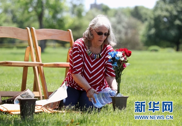 5月28日,在美国芝加哥西北郊的阿灵顿海茨公墓,“飞虎队”队员约瑟夫·库珀的女儿盖尔为父亲墓地上的鲜花浇水。新华网记者 汪平摄