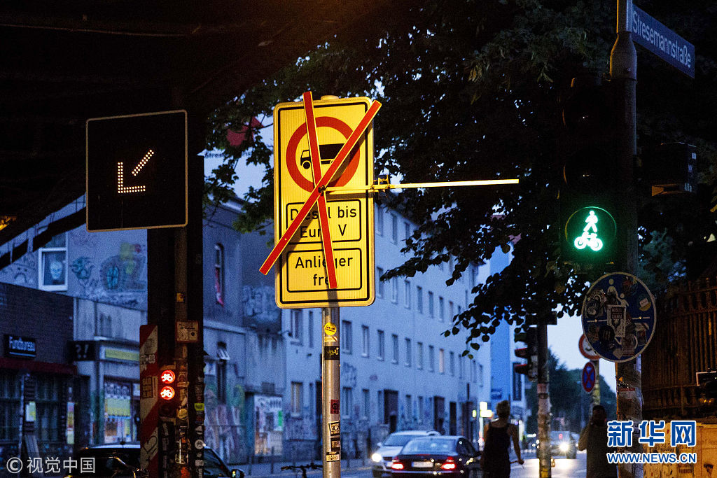 5月30日,德国汉堡,部分街道柴油车准入标志被拆除。遭禁的是未达到欧6排放标准的乘用车和卡车,禁行令将从5月31日起实施。为此,有关部门竖起共49块禁行牌及55块绕行牌。过渡期结束后,警方将开始监控。不过,该区域居民和企业的车辆以及送货车、救护车和垃圾车不在此限。(图片来源:视觉中国)