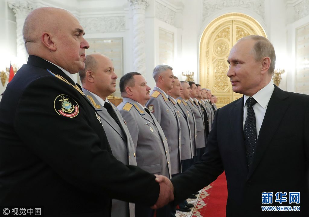 2018年5月31日,俄罗斯莫斯科,俄罗斯总统普京在克里姆林宫接见俄罗斯安全部队和司法当局高级官员,为其举行晋升仪式。(图片来源:视觉中国)