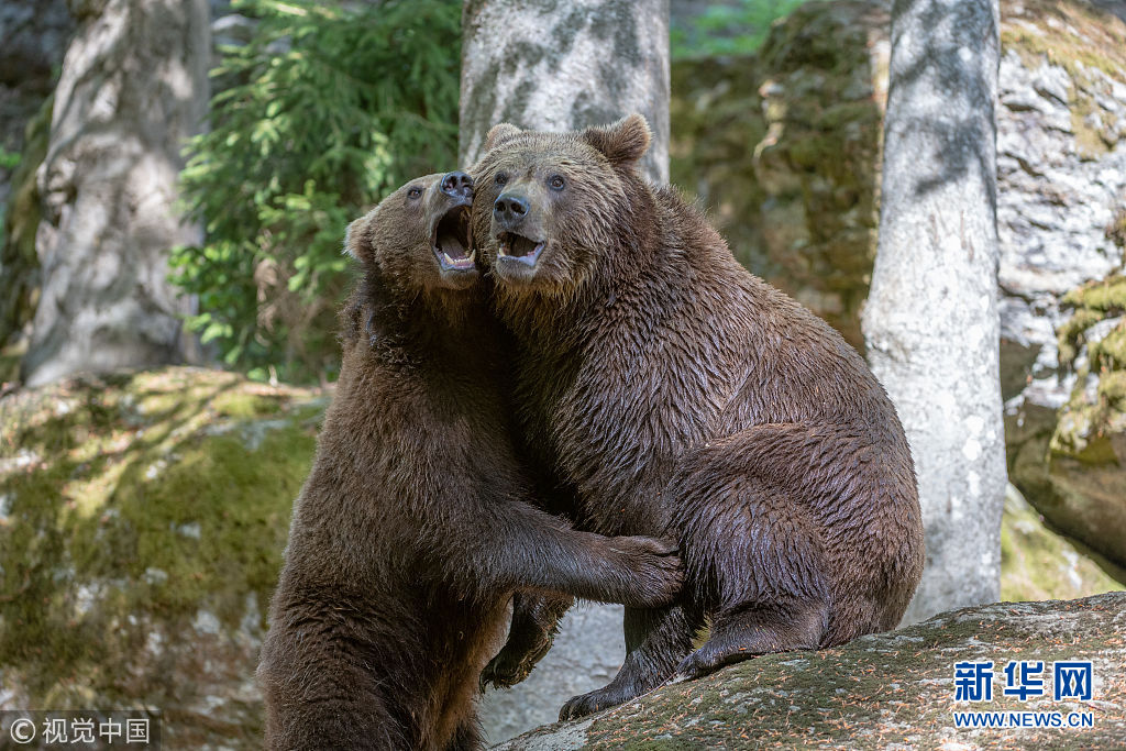 德国:小熊兄妹森林内嬉戏打闹亲密无间