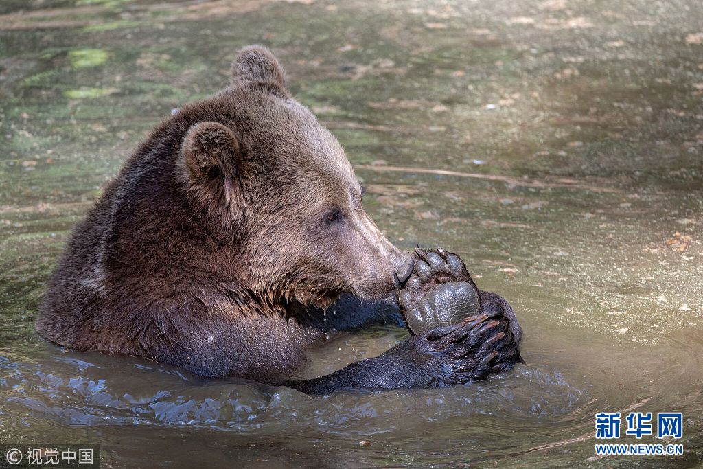 2018年4月27日,德国Neuschonau,在巴伐利亚的森林里,一名野生动物摄影师拍摄到两只幼熊在这里嬉戏,它们是一对兄妹,只有2岁,而他们的妈妈在不远处看着。玩耍打架是小熊的一种本能,是为了锻炼生存本能。(图片来源:视觉中国)