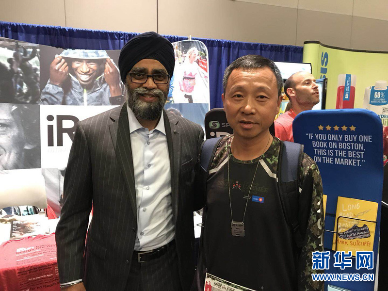 加拿大国防部长萨扬与朱海涛合影,称赞他连续4年参加马拉松,体现了现代中国军人的精神风采。新华网记者 李保东摄
