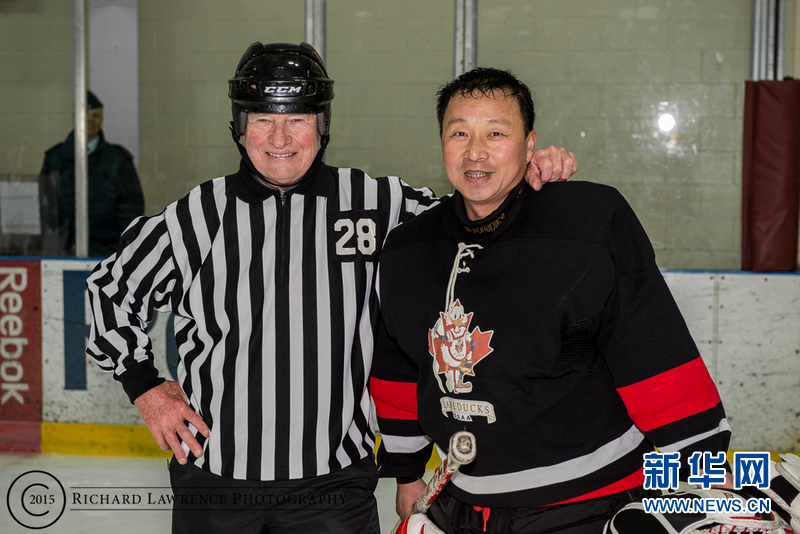 2015年12月,朱海涛武官与加总督兼三军总司令约翰斯顿在冰球赛场上。新华网发 理查德摄
