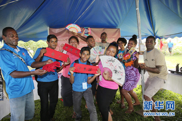 斐济青少年兴奋地展示他们的毛笔字及中国文化创意产品。 新华网记者张永兴 摄