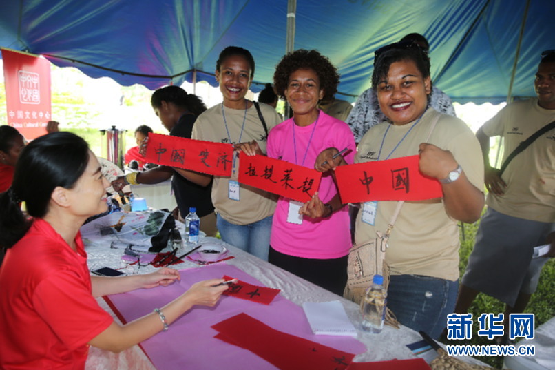 斐济青少年在展示她们的毛笔字杰作。 新华网记者张永兴 摄