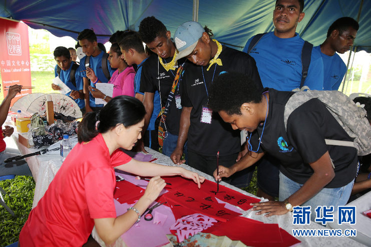 斐济青年正在中国文化中心老师的指导下用毛笔写自己的姓名。 新华网记者张永兴 摄