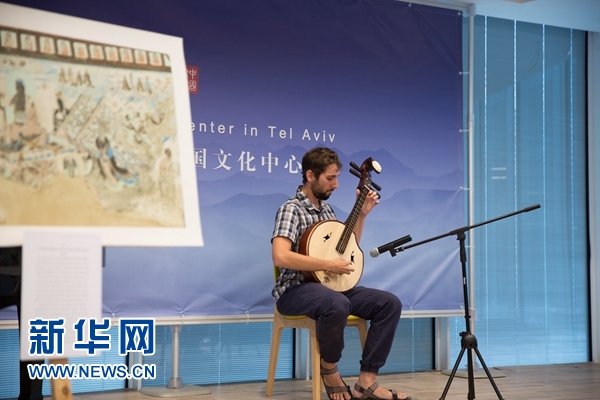 前来参观的以色列民众一边仔细观摩,一边饶有兴致地互相评点。曾经在中国四川成都学习中文的以色列艺术家莫安现场用中阮演奏了一曲《丝路驼铃》,将现场观众的思绪带到了古丝绸之路时代。