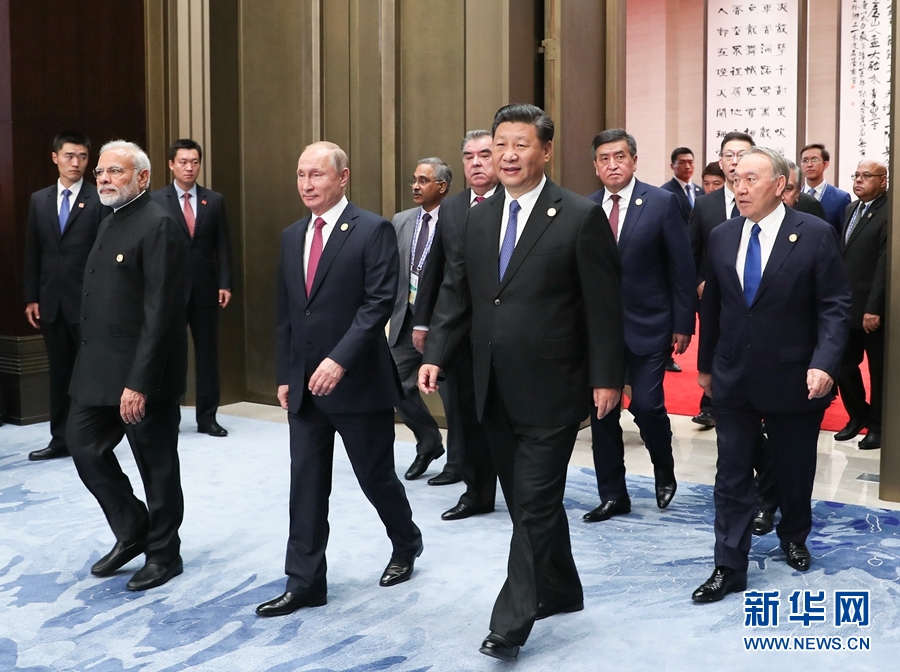 6月10日,上海合作组织成员国元首理事会第十八次会议小范围会谈在青岛国际会议中心举行。国家主席习近平主持。这是习近平同上海合作组织其他成员国领导人共同步入会场。新华社记者丁林摄