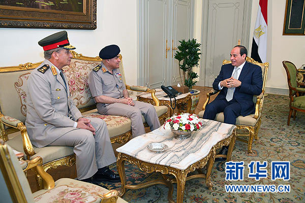 6月14日,在埃及首都开罗,埃及总统塞西(右一)和本届内阁新当选成员国防部长穆罕默德·扎基(左一)和前任国防部长西德基·苏卜希(左二)交谈。新华社/中东社