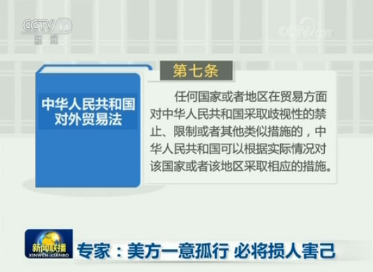 专家表示,中方采取的反制措施合理合法。根据《中华人民共和国对外贸易法》第七条,任何国家或者地区在贸易方面对中华人民共和国采取歧视性的禁止、限制或者其他类似措施的,中华人民共和国可以根据实际情况对该国家或者该地区采取相应的措施。
