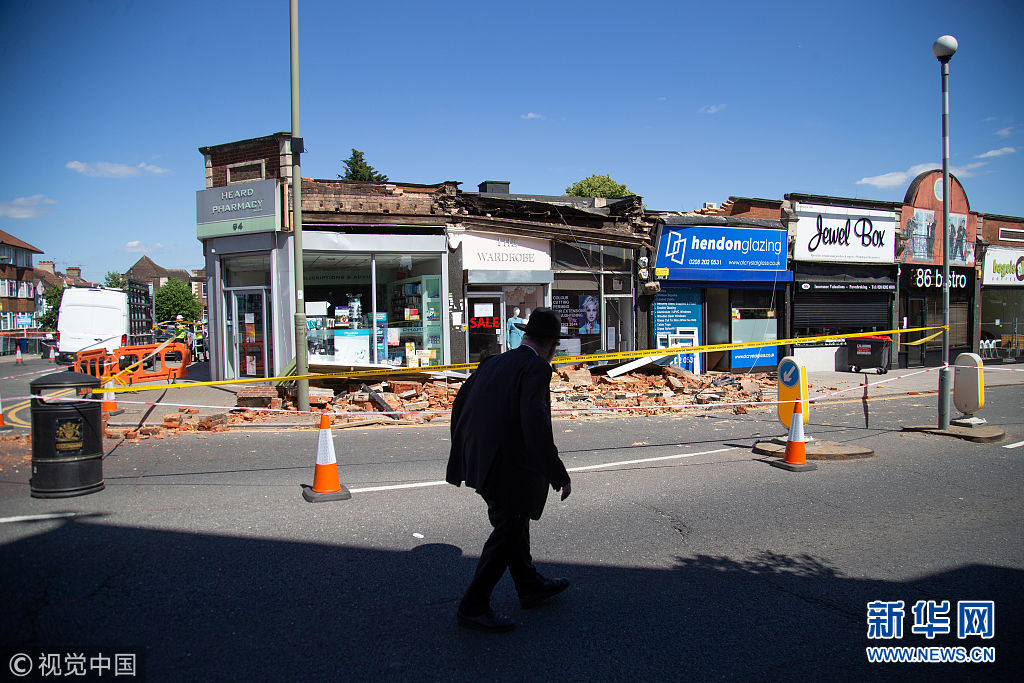 英国亨顿一排临街商铺发生坍塌 门前遍地废墟