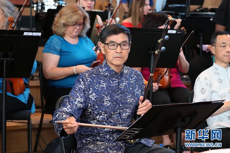 6月14日,在芝加哥千禧公园的普利兹克露天音乐厅,华人二胡演奏家李光龙在表演。新华网记者汪平 摄