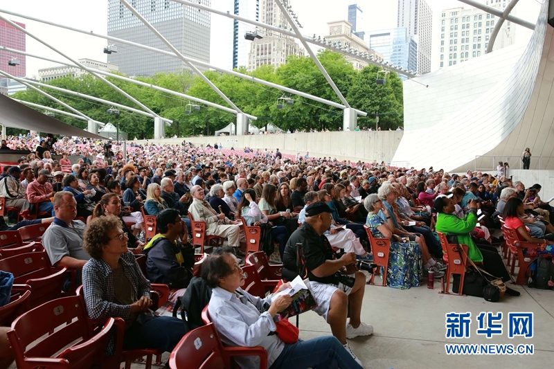 6月14日,在芝加哥千禧公园的普利兹克露天音乐厅,观众欣赏主题为《芝加哥:移民的故事》的音乐会表演。新华网记者汪平 摄