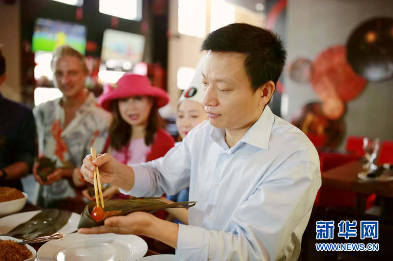 6月17日,在美国芝加哥,川菜大厨、美国中餐学会主席胡晓军在现场演示如何制作粽子。 新华网记者汪平 摄