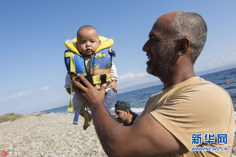 2015年8月22日,希腊莱斯博斯岛,来自叙利亚的难民顺利抵岸后举着一名小宝宝庆祝。(图片来源:东方IC)