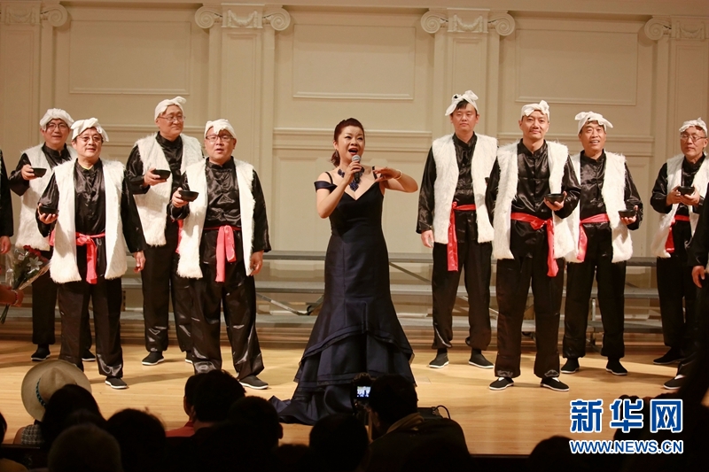 6月16日,在美国芝加哥,吴小萍在芝加哥华人艺术团男演员配合下演唱《红高粱-九儿》组曲。新华网记者 汪平摄