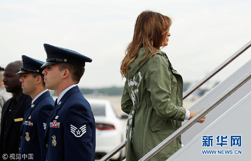 当地时间2018年6月21日,美国安德鲁空军基地,美国第一夫人梅拉尼娅·特朗普前往美墨边境看望移民儿童,而梅拉尼娅选的这件军绿色外套后边的设计竟然写着“我根本不在乎,你呢?”,引起热议。(图片来源:视觉中国)