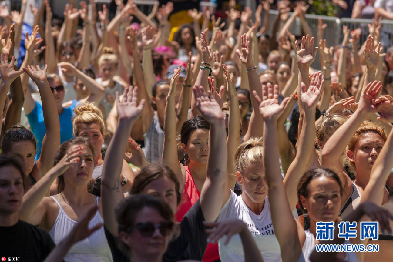 美国:民众时代广场练瑜伽场面壮观 庆祝夏至日到来