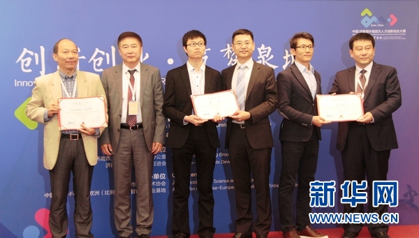 中国驻比利时使馆临时代办张弛(右三)、中国科协欧洲海智双创基地主任宋志伟(左二)和济南代表团团长武毅(右一)为一等奖获得者颁奖。新华网记者潘革平摄