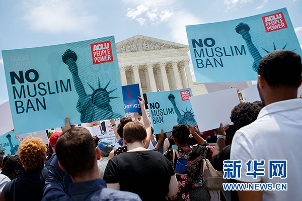 6月26日,在美国首都华盛顿,人们在联邦最高法院前抗议。美国联邦最高法院26日裁定,总统特朗普去年颁布的移民限制令“完全符合”总统职权范围。新华社发(沈霆 摄)