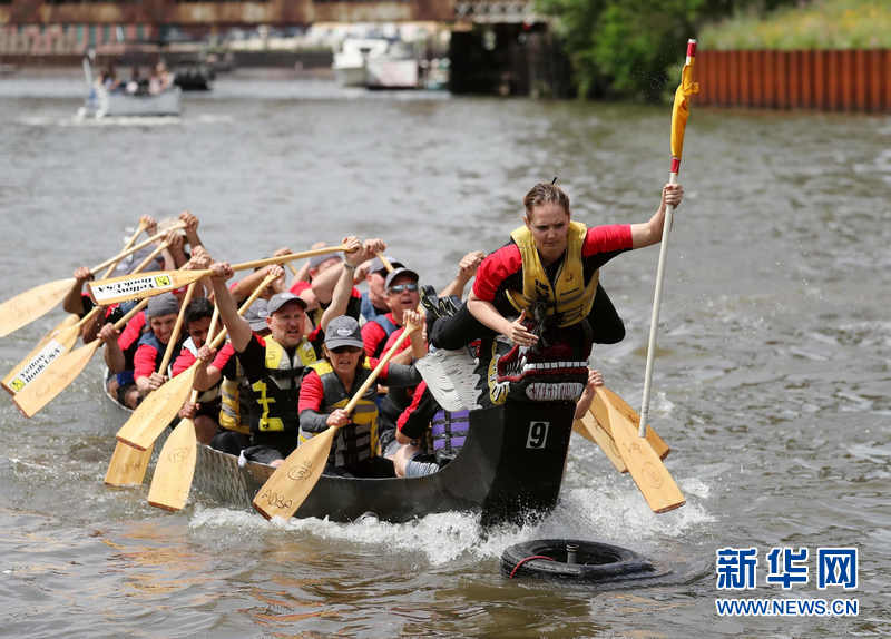 6月23日,在美国芝加哥,参加第18届芝加哥龙舟赛的队员在比赛中。新华网记者汪平 摄