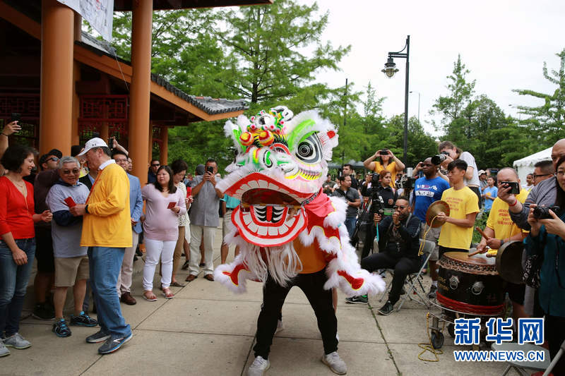 6月23日,在美国芝加哥,第18届芝加哥龙舟赛开幕式上进行的舞狮表演。新华网记者汪平 摄