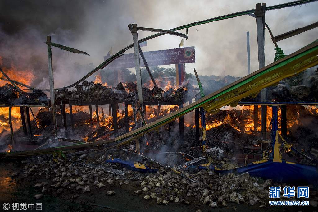 当地时间2018年6月26日,缅甸仰光,缅甸举行焚烧毒品仪式以纪念国际禁毒日。当天执法部门焚烧了价值1.87亿美元的非法毒品。“金三角” (Golden Triangle) 位于东南亚泰国、缅甸和老挝三国边境地区,这一地区盛产鸦片等毒品、是世界上主要的毒品产地。(图片来源:视觉中国)