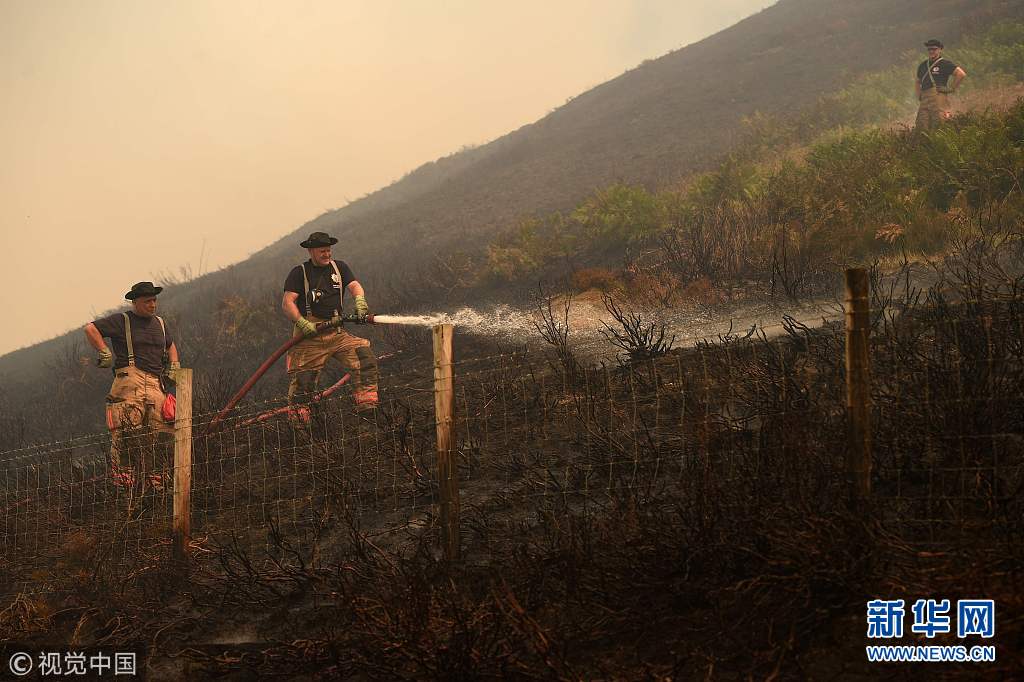 当地时间2018年6月27日,英国斯泰利布里奇,消防员继续灭火。据英国媒体报道,周三火情已从沙德伍兹沼泽蔓延接近居民区,覆盖面积6平方公里,英国陆军已经待命,随时准备救援。目前已经有超过50户居民被疏散。消防方面表示,由于火灾覆盖范围大,灭火任务十分艰巨,已经派出了50名消防员前往一线救援。(图片来源:视觉中国)