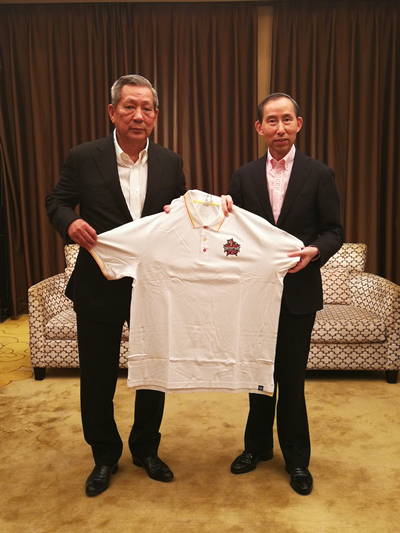 龙宇翔向披尼赠送昆仑鸿星冰球队球衣。