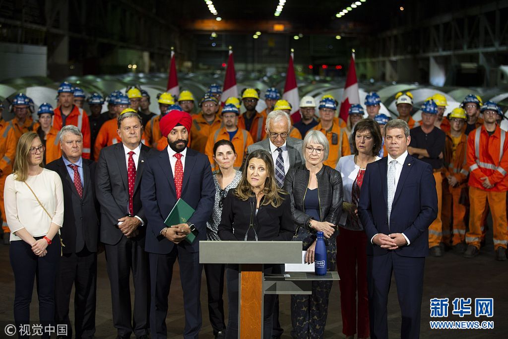 当地时间2018年6月29日,加拿大汉密尔顿,加拿大外交部长弗里兰、经济发展部长贝恩斯和劳工部长哈伊杜造访斯特尔科钢铁公司,并共同宣布从7月1日起,加拿大将对约126亿美元从美国进口的商品加征关税,以报复特朗普政府对加拿大钢铝产品加征关税。他们还表示,加拿大政府将向本国钢铝产业和制造业提供约15亿美元财政援助。(图片来源:视觉中国)