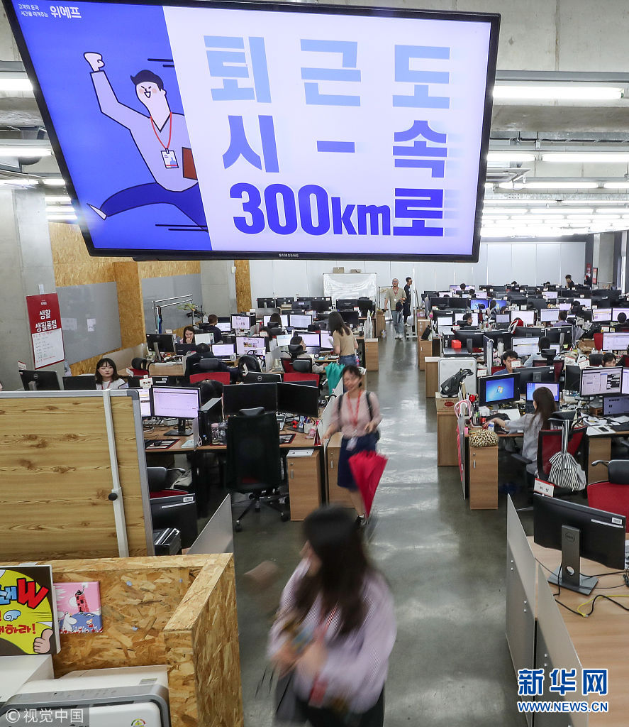 当地时间7月2日下午,韩国首尔,韩国电商薇美铺总公司员工准点下班,大屏幕上打出“下班速度每小时300公里”的标语。当天韩国迎来实施每周52工时制后的第一个星期一。(图片来源:视觉中国)