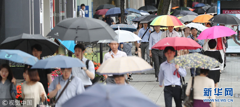 当地时间2018年7月2日下午,韩国首尔,打着伞下班的上班族。当天韩国迎来实施每周52工时制后的第一个星期一。(图片来源:视觉中国)