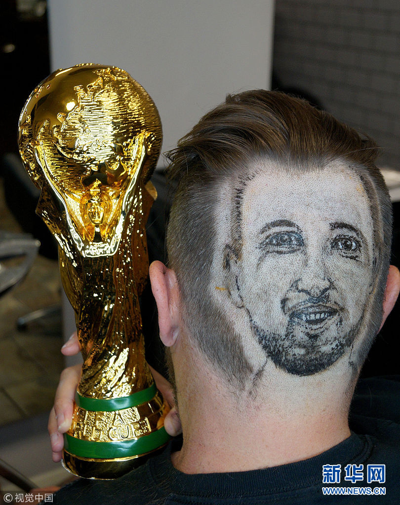 2018年7月3日讯(具体拍摄时间不详),英国,48岁的Kai Ward将英格兰球星哈里·凯恩的头像做成了自己的发型。这位热血英格兰球迷请50岁的造型师Daren Terry将凯恩的形象“剃”在了自己的后脑勺上,以此来纪念凯恩目前排在本届世界杯的射手榜首位,并向三狮军团表“忠心”。(图片来源:视觉中国)