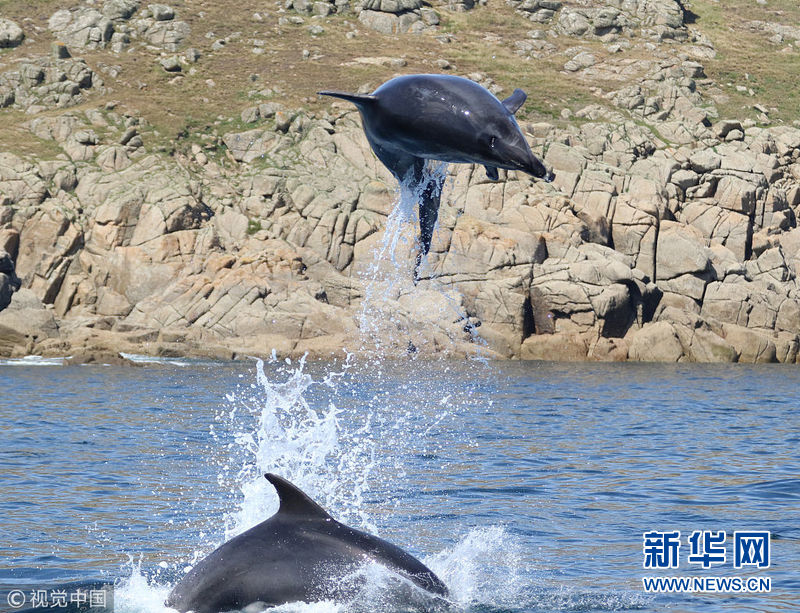 2018年7月4日讯(具体拍摄时间不详),英国康沃尔,一群旅客在海岸线拍到了海豚跃出海面的神奇场景。(图片来源:视觉中国)