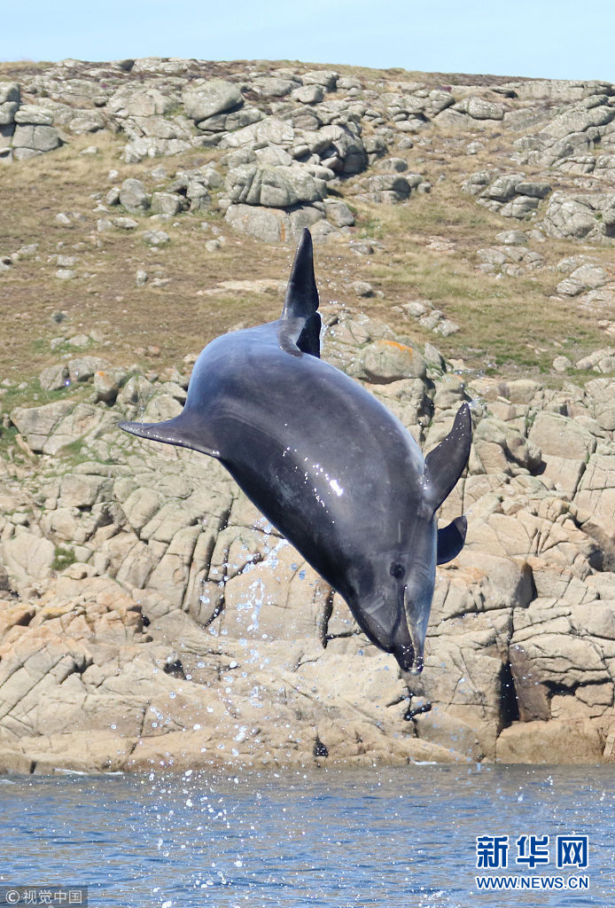 2018年7月4日讯(具体拍摄时间不详),英国康沃尔,一群旅客在海岸线拍到了海豚跃出海面的神奇场景。(图片来源:视觉中国)