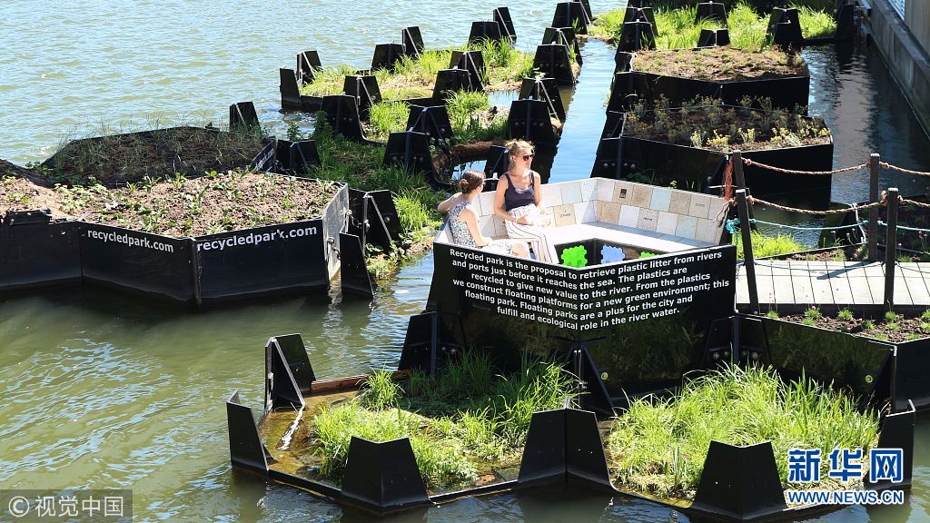 当地时间2018年7月4日,荷兰鹿特丹,奥迪环保基金会与项目合作伙伴Recycled Island基金会在鹿特丹港口开放首个由塑料废物制成的漂浮公园。这个漂浮公园现在是游客和居民的休闲区。 (图片来源:视觉中国)